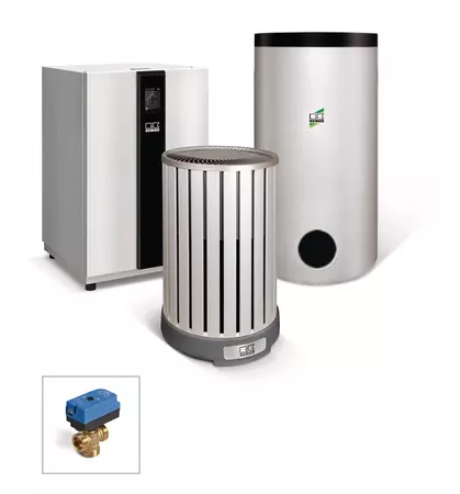 Wenn die Wärmepumpe als alleiniger Wärmeerzeuger vorgesehen ist, ist dieses Wärmepumpen-Paket die ideale Lösung. In Verbindung mit einer Fußbodenheizung oder modernen Heizkörpern ist dieses Gerät perfekt geeignet. Neben der Heizfunktion kann im Bedarfsfall eine Kühlfunktion realisiert werden. Die Trinkwasserbereitung erfolgt in diesem Paket mittels des externen EWS 304 E Trinkwasserspeichers. Durch die kompakte Bauweise ist der Installationsaufwand äußerst gering. Die hocheffizient geregelte Heizkreispumpe im Innenmodul kann die Heizkreise direkt mit Wasser versorgen.