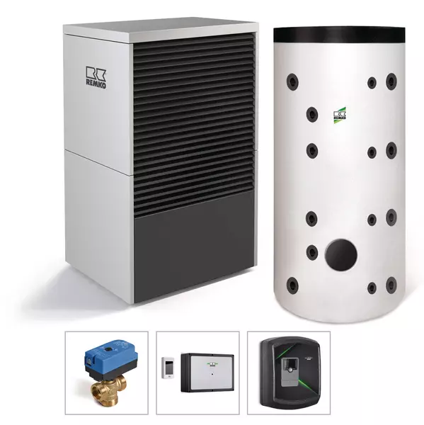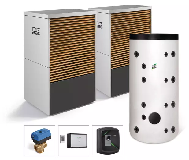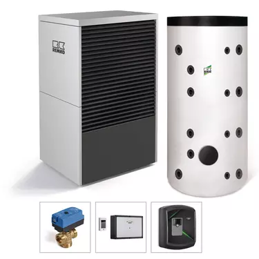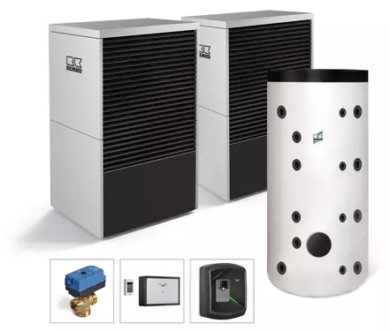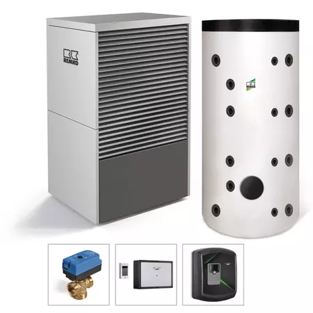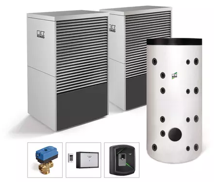 Das Energiespar-Paket ist für die Einbindung von solarthermischen Anlagen oder eines Festbrennstoffkessels zur Heizungs- und Warmwasserunterstützung geeignet. Mit dem Rippenrohrwärmetauscher (Sonderzubehör) RWT 31 können Kollektorflächen von 8 bis 15 m² angeschlossen werden. Die Trinkwasserbereitung erfolgt mittels eines 800 Liter- oder 1000 Liter-Pufferspeichers und einer elektronisch geregelten Frischwasserstation im hygienischen Durchflussverfahren. Mit diesem Wärmepumpen-Paket sind sowohl bivalente als auch monoenergetisch betriebene Systeme realisierbar. Die separate Pumpenbaugruppe HGM/HGU (optional zu bestellen) für den Heizkreis ist mit einer bedarfsgerecht geregelten Hocheffizienzpumpe ausgestattet.