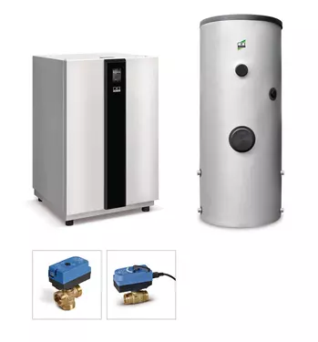Wenn die Wärmepumpe als alleiniger Wärmeerzeuger vorgesehen ist, ist dieses Wärmepumpen-Paket die ideale Lösung. In Verbindung mit einer Fußbodenheizung oder modernen Heizkörpern ist dieses Gerät perfekt geeignet. Der zusätzliche Kombipufferspeicher KWS 300 dient zur hydraulischen Volumenvergrößerung oder Entkopplung bei großen Volumenströmen. Optional kann im Bedarfsfall mit dem Kühlmodul (Zubehör) eine passive Kühlfunktion für den Sommer realisiert werden. Die Trinkwasserbereitung erfolgt in diesem Paket mit dem emaillierten Trinkwasserspeicher KWS 300. Mit diesem Wärmepumpenpaket sind monovalente Systeme realisierbar.